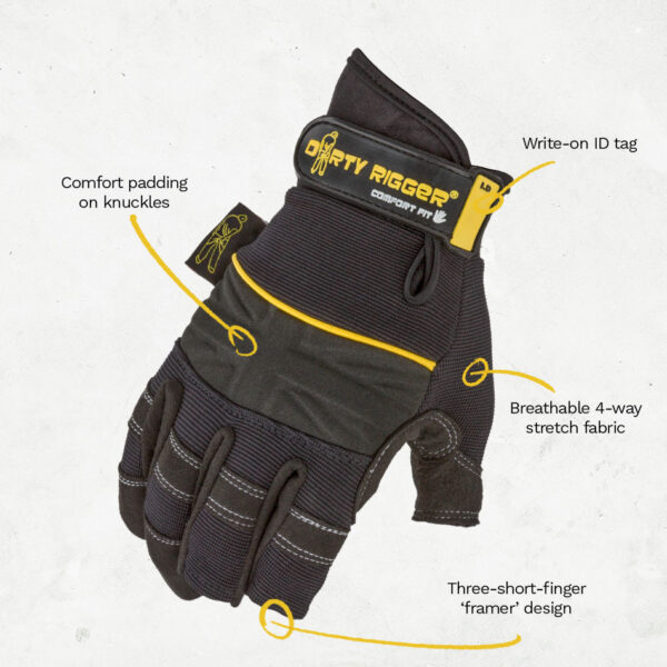 As framer são um meio-termo interessante - têm o polegar, o indicador e o dedo médio expostos, mas os outros dois dedos protegidos. Foram originalmente desenhadas para carpinteiros (daí o nome "framer"), mas muitos riggers adoram-nas porque dão aquele equilíbrio perfeito entre proteção e destreza.